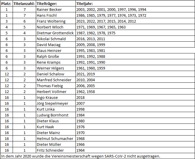 In der Ewigen Rangliste konnte Franz mit seinem sechsten Vereinsmeisterschaftstitel näher an die Rekordhalter Rainer Becker und Hans Fischl mit jeweils sieben Titel heranrücken.