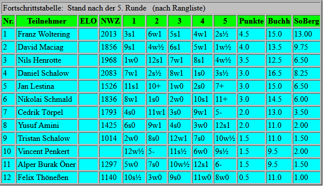 Nach spannenden Verläufen in den ersten vier Runden, stand vor Beginn der fünften Runde Franz Woltering mit 4 Punkten aus 4 Partien an der Spitze, dicht gefolgt von David Maciag mit 3,5 aus 4. Natürlich wollte es die Auslosung nicht anders, dass beide Spieler in der letzten Runde aufeinandertrafen, mit der Konstellation, dass nur noch einer der beiden Spieler beide Titel gewinnen konnte. Daher war die Ausgangposition vor der letzten Runde klar, Franz braucht nur ein Remis und David musste die Partie gewinnen. Nach kontrolliert aggressiver Eröffnung konnte David leichte Vorteile gewinnen und nach Übergang ins Mittelspiel den Druck weiter erhöhen, so dass Franz immer stärker in die Defensive gedrückt wurde. Hier fiel die Entscheidung in der Zeitnotphase, in der zwar Franz die schlechtere Zeit aufwies, aber David paradoxerweise die schlechteren Züge machte und in ein Abspiel abwickeln musste, dass Franz leicht Remis halten konnte. Damit holt sich mit 4,5 aus 5 Franz beide Titel. David wird mit 4 aus 5 zweiter und der dritte Platz geht mit 3,5 aus 5 an Nils Henrotte.